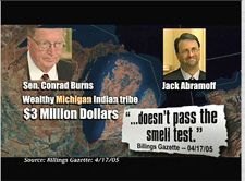 The ad highlights Burns connections to controversial lobbyist Jack Abramoff, who is currently under federal investigation. Between the years 2001 and 2004, Conrad Burns received more campaign contributions than any other member of Congress from Abramoff, his partner, and his tribal clients.