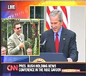 We kid the President. It doesn't look like the reporter minded, but it's just another day of "Bizarro" Bush conferences.