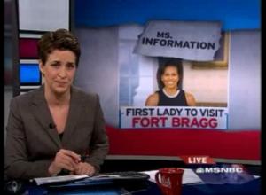 From Rachel Maddow's Ms. Information segment. A President who actually wants to fund the VA with a wife taking a personal interest in military families. Isn't that a breath of fresh air? Like everything President Obama has done during his short term in office or not this is definitely a change from the last administration who was more content using our troops as props than anything else. Michelle Obama has plans to visit Fort Bragg.
