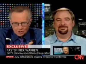 Rick Warren apparently called in sick and canceled his appearance on This Week just moments before the show started. I've got to wonder if it was due to some of his fellow church leaders not being too happy with him for this interview he gave on Larry King Live the other night.