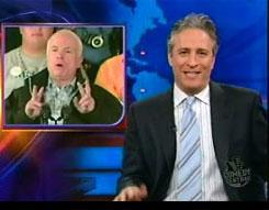 Last night on The Daily Show, Jon Stewart went to town on John McCain's Meet the Press "senior moment" and his increasing use of condescending air quotes, or as Stewart calls them, "d*ck fingers."