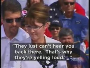 Supporters at the far reaches of the audience apparently couldn’t hear what Palin was saying, and began chanting “Louder, louder!” the Associated Press reports; the chant spread from there.